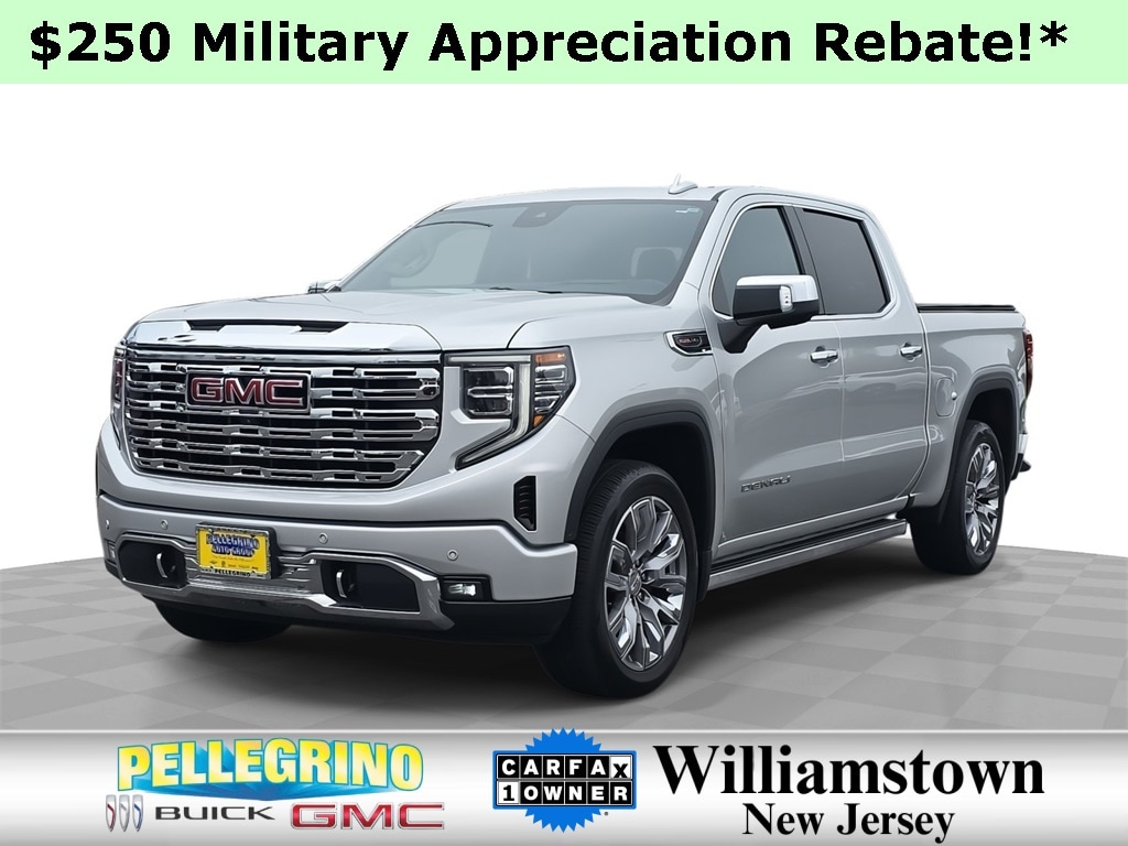 Experience bold performance and premium refinement in this CarBravo Certified 2022 GMC Sierra 1500 Denali Crew Cab 4WD, finished in Quicksilver Metallic with a Jet Black leather interior. Equipped with the powerful 6.2L V8 engine and 10-speed automatic transmission, this Sierra delivers confident capability and smooth power. The Four-Wheel Drive system, locking/limited-slip differential, and advanced suspension ensure its ready for rugged tasks or refined cruising. The Denali Reserve Package enhances the truck's upscale presence with aluminum wheels, a power sunroof, and power-retractable running boards. It also includes a convenient bed liner, fog lamps, and a power rear sliding window.